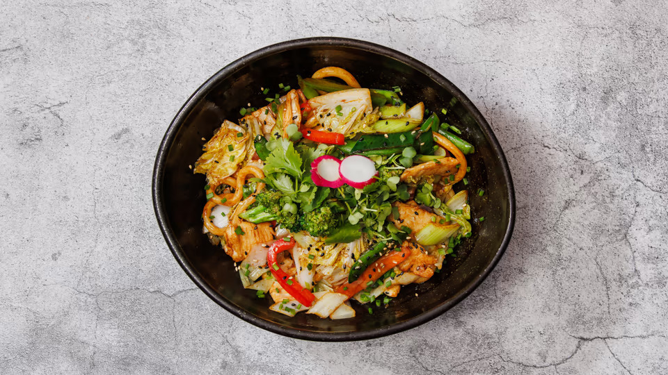 tăiței de orez cu legume și pui