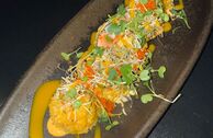 cu somon, crab regal, mango și sparanghel