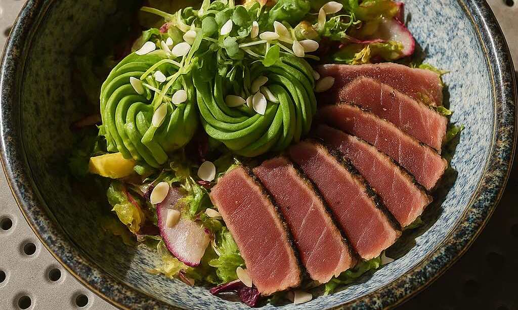 ton prăjit cu avocado, coriandru, mango, tobiko și salată